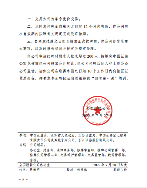 公司于2022年7月27日已取得全國股轉(zhuǎn)公司掛牌同意函,將于近期掛牌交易(代碼873805)。