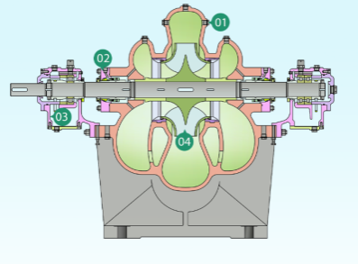 4.優(yōu)化的雙吸葉輪水力設(shè)計(jì),高效、穩(wěn)定、高抗汽蝕性能,自平衡軸向力。甩油環(huán)稀油潤滑。